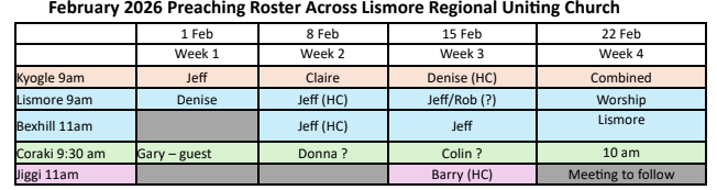 (Lismore Regional Uniting Church is the collective name for the Uniting Church in Australia worshipping communities at Bexhill, Coraki, Jiggi, Kyogle and Lismore)