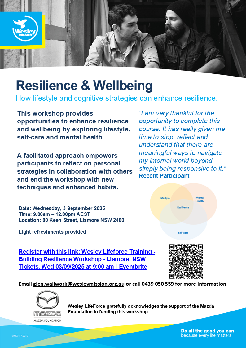 Wesley Mission are providing free Building Resilience worships in September, in our region. On Tuesday 2nd of September it is being held in Byron Bay, 9am – 12pm at the Byron Community Centre, 69 Johnson Street, Byron Bay